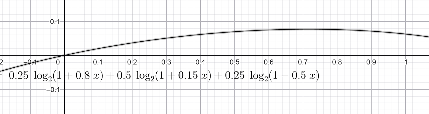 函数是\(0.25 \log (1+0.8x) + 0.5 \log (1+0.15x) + 0.25 \log (1-0.5x)\)